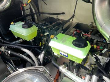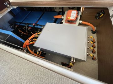 Iso ajoakku on haaste paitsi sen painon, myös sijoituksen kannalta. Varsinkin kun kyseessä on olemassa olevan polttomoottoriveneen konversio. Siksi ajoakusto on kasattu kahdeksasta akkumoduulista, jotka on jaettu kahteen neljän moduulin ryhmään. Niitä toinen on sijoitettu paapuurin puolen makuukajuutan vuoteen alle, toinen styyrpuurin laidalla lattian alla olevaan säilytystilaan. Akuston jakaminen tarkoittaa luonnollisesti lisätöitä kaapelointiin ja akkujen jäähdytysjärjestelmään. Ihan yksinkertaisesta kokonaisuudesta konversiossa ei siis ole kyse.