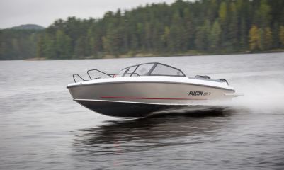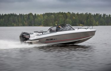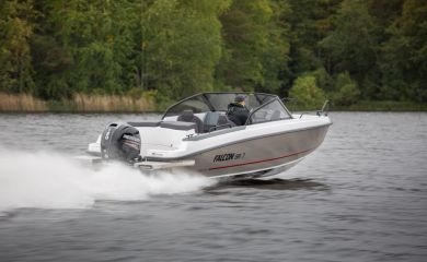 Muotoilullisesti Falcon edustaa sporttista, vesiurheiluun ja päiväretkiveneilyyn mielikuvissa yhdistyvää bowrider-linjaa, mutta detaljeissa, kuten alumiinisessa turkkilevysarjassa ja kalastustasoissa huomio siirtyy astetta arkisempaan ja hyötyvenemäisempään suuntaan.