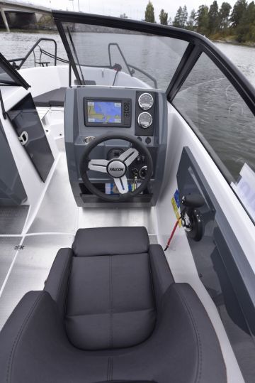 Falconin laatuvaikutelma ja vakiovarustus ovat tavanomaista perustasoa. Pienempien nippeleiden osalta mukana on jo esille tuotujen varusteiden lisäksi esimerkiksi kuskin puolen tuulilasinpyyhin, lepuuttimien pidikkeet ja telineet, ajotietokonetoiminnot sisältävä mittaristo sekä hyvä valikoima virtapistokkeita (3 x 12 V ja 2 x usb). Heittokalastusinnosta kertoo keulan sähkömoottorivalmius.