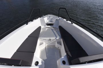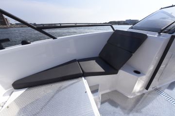 BR 8 onnistuu kuitenkin tuntumaan tilavalta, sillä 2,6 metrin kokonaisleveys on kokoluokan kärkeä. Taka-avotilan u-sohva on mukava paikka 4–5 henkilölle. Ohjaamon erillisistuimet kääntyvät ja pöydän saa lisävarusteena. Keula soveltuu tässä kokoluokassa istuskeluun tai loikoiluun lähinnä veneen ollessa paikallaan.