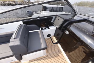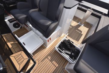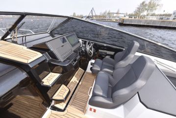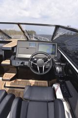 Massiivinen tuulilasi suojaa hyvin ajoviimalta ja tuulelta, myös sivuilta. Näkyvyys on silti hyvä ja ohjaamon ergonomia muutenkin kunnossa. Vasen käsi lepää luontevasti ratilla, oikealle kädelle on puolestaan kyynärnoja ja tekemistä kaasukahvojen, trimmien, keulapotkurin, joystickin ja plotterin käyttelyssä.