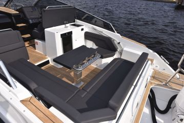 Kookkaan daycruiserin tilojen keskiössä on luonnollisesti avotila, jossa lääniä riittää. T9:ssä isoin elementti on perästä paapuurin laidalle kaartuva kulmasohva, jonka pidempi sivu on yli kaksimetrinen ja lyhyempikin vain karvan alle. Iso kulmasohva on myös mukava. Sohvan ääressä oleva pöytä on asennettu sähköiselle jalalle.