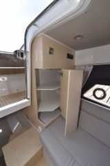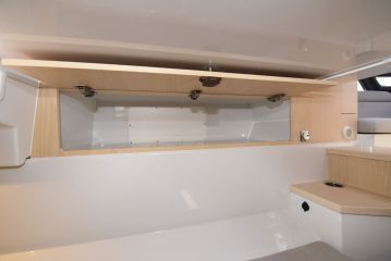 Daycruisereille tyypilliseen tapaan kajuutassa ei ole täyttä seisomakorkeutta. Jos sitä kaipaa, tulee katseet suunnata korkeampirunkoisiin ja -kantisiin sportcruisereihin. T9:n kajuutassa on kuitenkin pukeutumista helpottava ja pienimuotoisen oleskelunkin mahdollistava minisohva paapuurin laidalla.