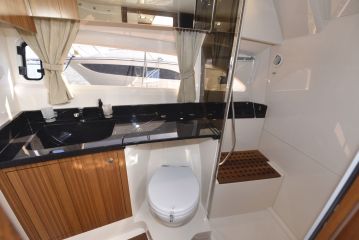 Matkaveneeseen kuuluu kunnon pentteri, ja 360 CC:ssä sellainen todellakin on. Petteri on sijoitettu oleskelutilojen yhteyteen pääkannelle, ohjaamon ja perän sohvaryhmän väliin. Köökin kokoa on kasvatettu hajauttamalla se veneen molemmille laidoille.
