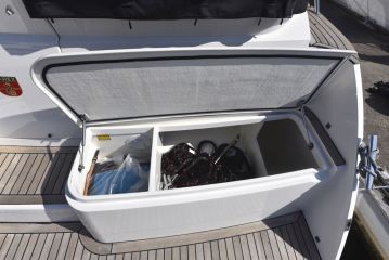 Marexin runsaat säilytystilat on jo pariin otteeseen huomioitu, mutta kehut voi ulottaa koskemaan myös käytännössä koko venettä. Monet lokeroista, kaapeista ja laatikoista ovat kaiken lisäksi poikkeuksellisen kookkaita, selkeämuotoisia ja helppoja käyttää. Jos jotain, niin lähinnä ohjaamoon ja apukuskin paikan yhteyteen jää kaipaan pientavaralokeroa, mihin kännykkä, aurinkolasit tai muuta vastaavaa olisi luontevaa laskea. Kojelaudan päällä on kyllä iso avolokero, mutta se jää kuskin paikalla istuessa kauas ja katseen ulottumattomiin.