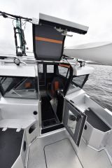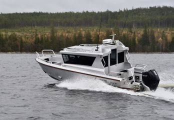 Vaikka hytti on varsin korkea ja toisen koeajoveneen katolle on pakattu kajakki ja maastopyörä korostamaan kaikkia seikkailumahdollisuuksia, on heti ensivilkaisulta selvää, että tällä koppiveneellä maisema vaihtuu tarvittaessa liukkaastikin. Voimanlähteenä on nykytyyliin perämoottori, joka on ripustettu runkoon integroituun bracketiin eli telineeseen.
