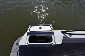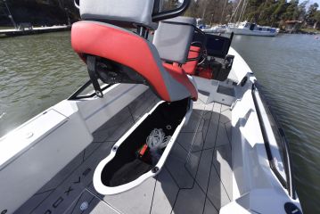 Veneessä oleskeluun liittyvää kekseliäisyyttä löytyy sen sijaan korotetun keulatäkin alta, jossa olevan ison tavaralaarin pohjalle sopii sama lisävarusteena saatava patjasarja kuin kannen päälle. Camping-henkisen majoittumismahdollisuuden viimeistelee avoimeen luukkuun sopivat kuomuseinämät, luukun ikkuna, virtapistoke ja valaisin. Tässäpä todellinen teltta-daycruiser.