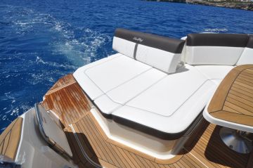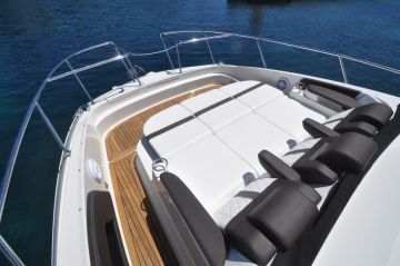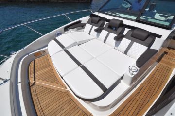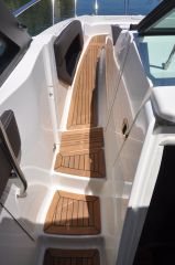 Sea Ray on keksinyt vihdoin keulakannelle todellista käyttöä toteuttamalla sinne kolmen hengen divaanin. Loikoilualustaa pystyy kohottamaan polvitaipeiden kohdalta ja selkänojaan kuuluu säädettävä niskatuki ja esiin taittuvat kyynärnojat. Mukaan mahtuu halutessa myös lisävarustelistalta löytyvä drinkkipöytä.