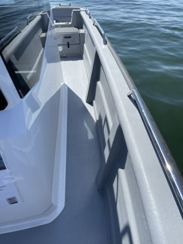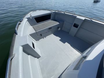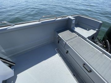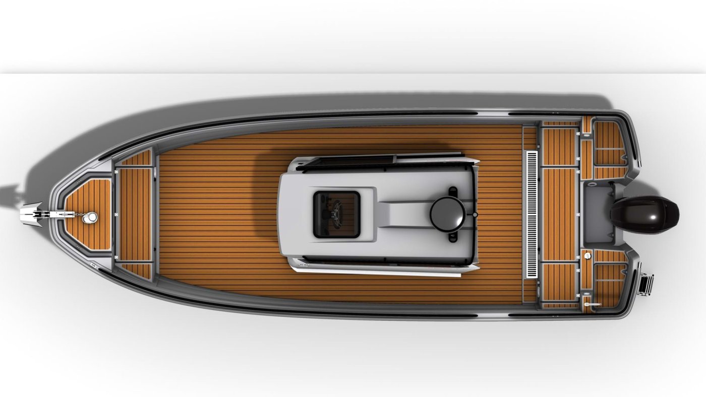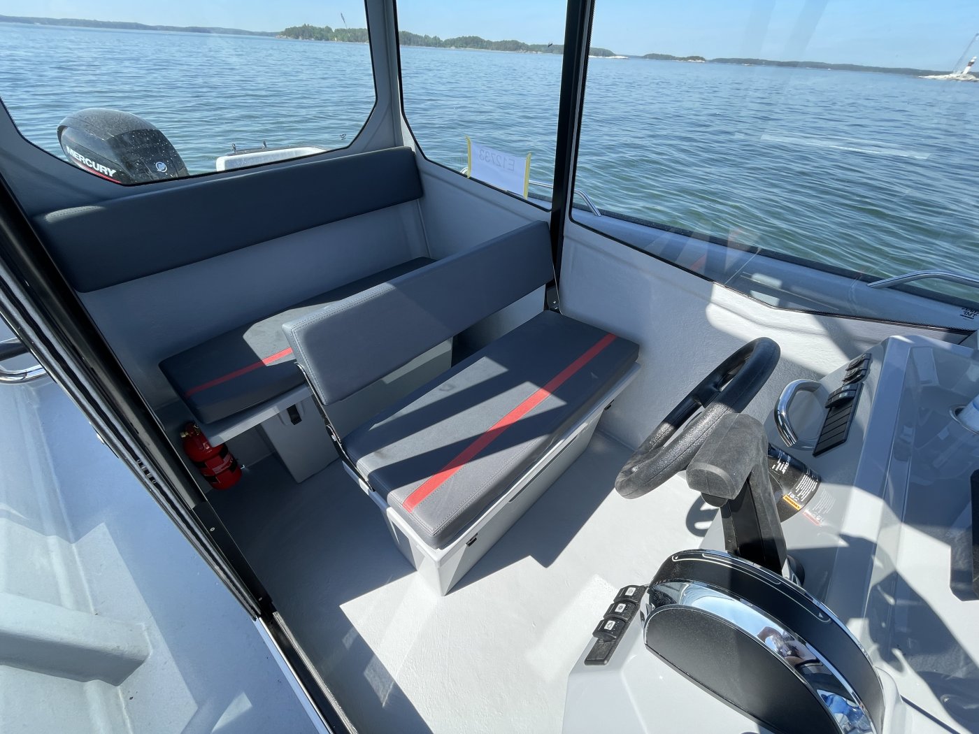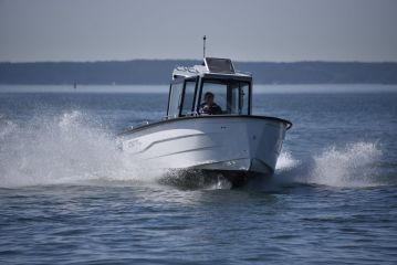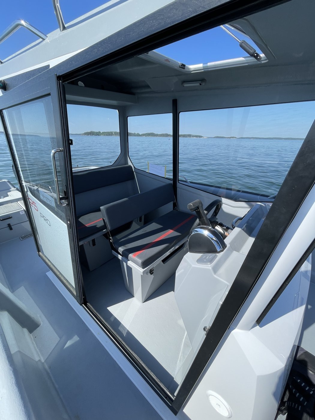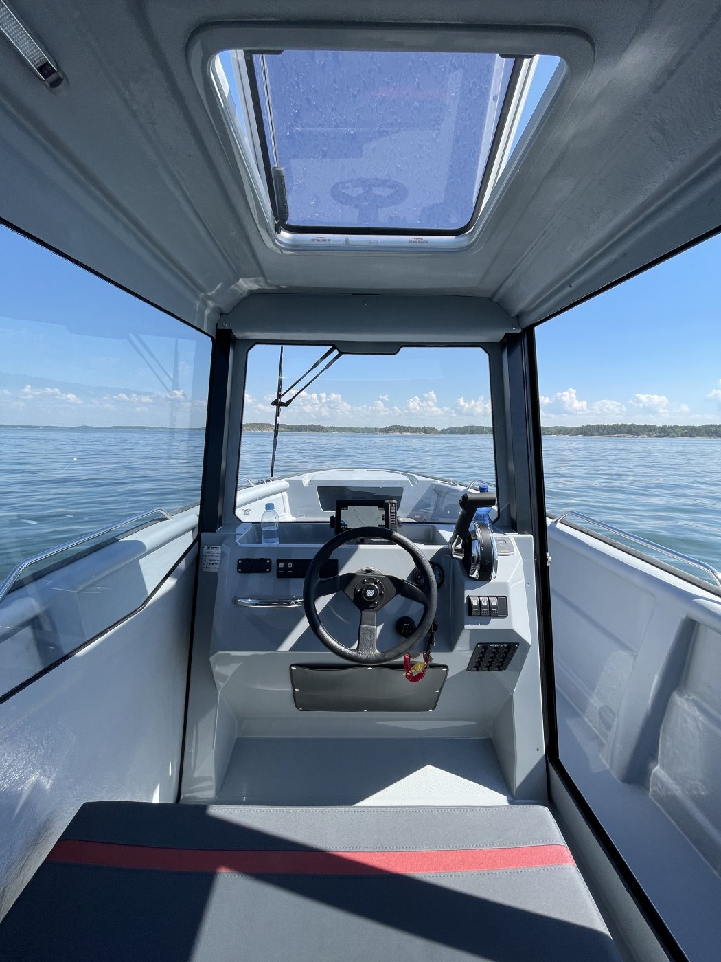 Kuskin paikka on 725 Pro Cabin XL:ssä aika lähellä veneen keskilinjaa ja pitkittäisen painonjakauman kannalta luontevassa kohdassa, mistä ulkomittojen ja optimaalisen kulkuasennon hahmottaminen on helppoa. Ergonomiassa parasta on esteetön näkyvyys ja kuskin paikalle kulkemisen ja sieltä poistumisen helppous.