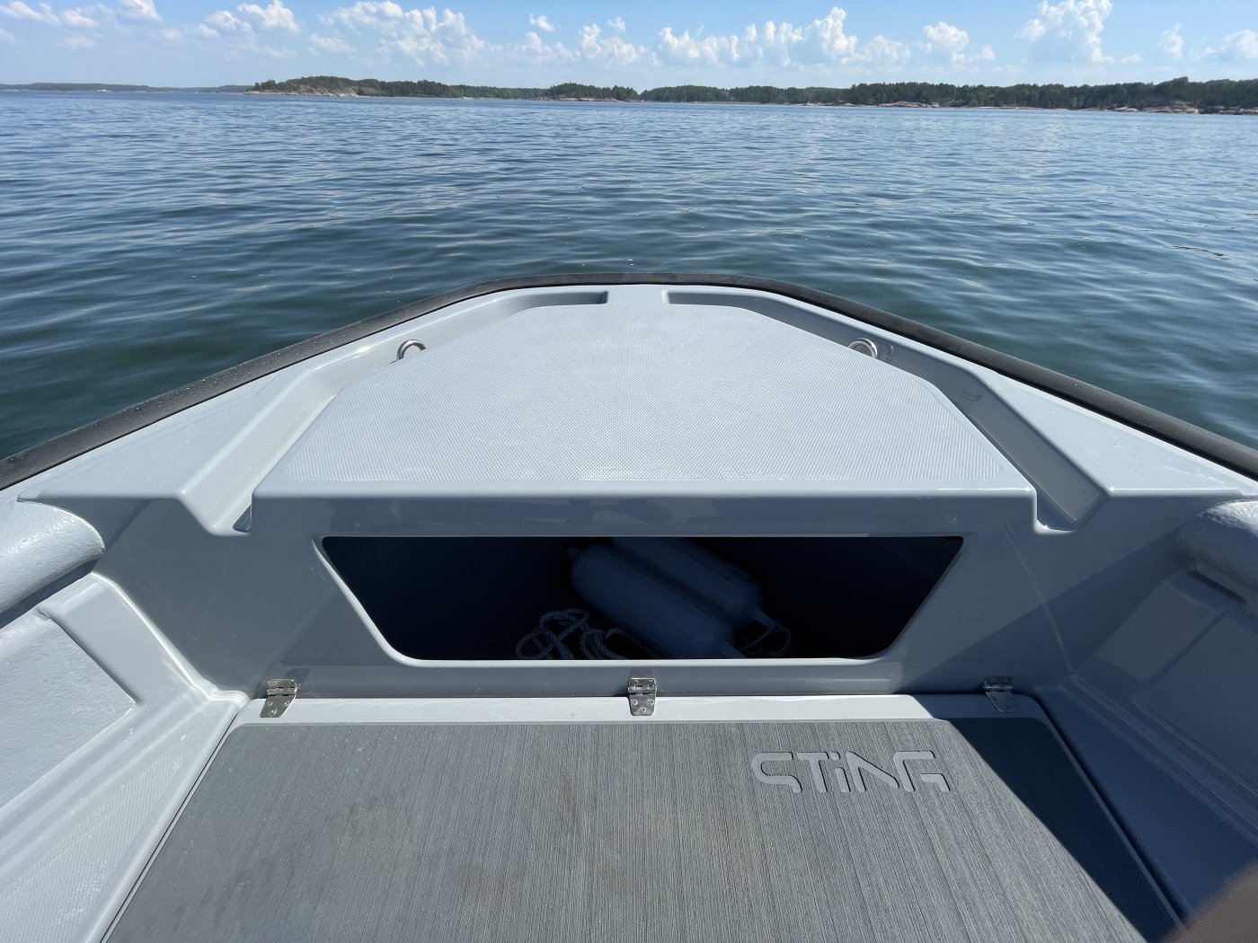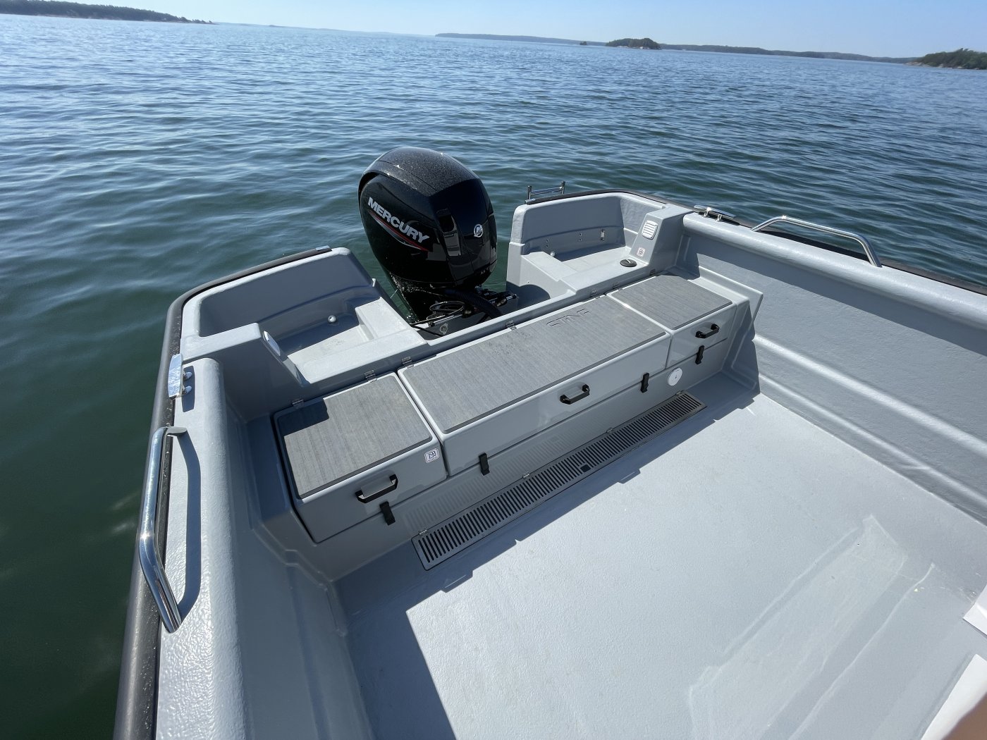 Ei Stingillä ajaminen kuitenkaan tuskaa ole. Uppoumanopeuksilla 725 Pro kulkee kiitettävän suuntavakaasti, eikä liukuvarunkoisille perämoottoriveneille tyypillistä kiemurtelua esiinny oikeastaan lainkaan. Erityisen hyvä asia se on siksi, että lisävarusteena hankittava hydrauliohjaus on harmillisen tahmea.