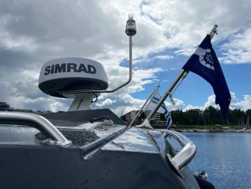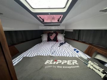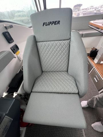 Tässä jutussa käsiteltävä Flipper 900 ST valmistui vuonna 2022, mutta se otettiin käyttöön vasta vuotta myöhemmin. Veneessä onkin yhä roimasti uuden veneen tuntua, eikä moottoreiden ajotuntimäärä ole vielä ylittänyt sataa. Kokonaisuus vaikuttaa huolella pidetyltä, ja yleisilme on siisti sekä teknisesti että visuaalisesti.