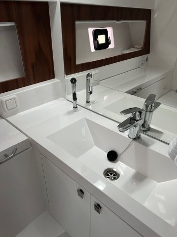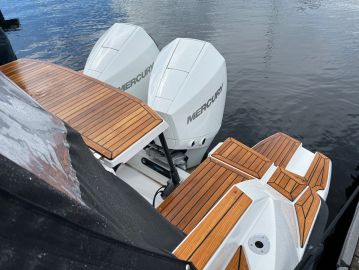 Voimanlähteenä on kaksi 225-hevosvoimaista Mercuryn V6 -moottoria. Yhdistelmä riittää mainiosti: vene nousee vaivattomasti liukuun ja huippunopeus kohoaa lähes 42 solmuun. Matkavauhti löytyy noin 28 solmun tuntumasta, jolloin kulutus pysyy hieman yli kahdessa litrassa merimailia kohden. Moottorien ääni on miellyttävä, ja rungon 18 asteen V-kulma leikkaa aallokkoa pehmeästi ilman ylimääräisiä runkoääniä tai muuta kolinaa.
