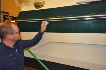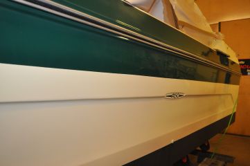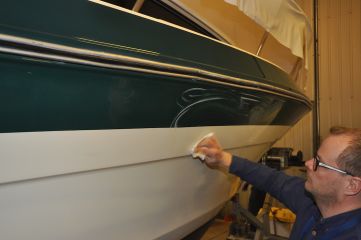 Me levitimme TFC-pinnoitteen reilut 30 vuotta vanhaan veneeseen, jossa oli tarjolla monenlaista pintaa: hivenen kerman sävyyn taittuvaa valkoista sekä vihreää pigmentin melko vahvasti menettänyttä gelcoatia. Vihreä runkoraita oli ehostettu vuotta aiemmin, toiselta sivulta myllyttämällä ja toiselta sivulta maalaamalla, mutta etenkin myllytetty sivu oli kulahtanut vuodessa. Vertailun vuoksi runkoon työstettiin vertailukohta myös perinteisellä vahalla.
