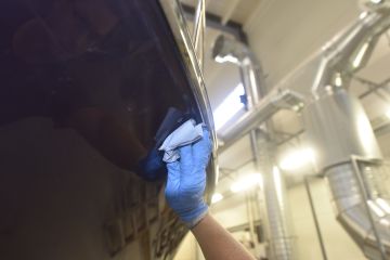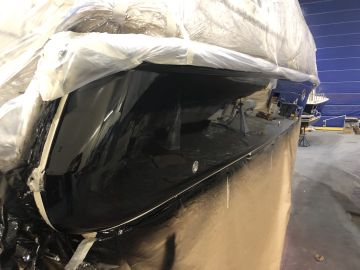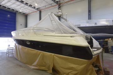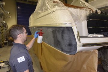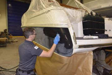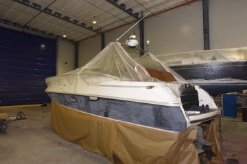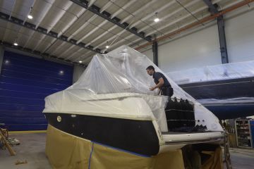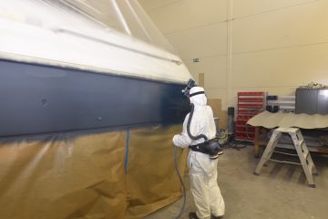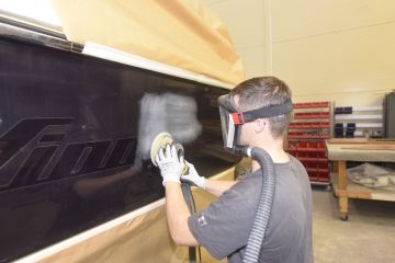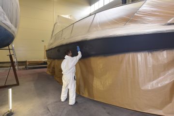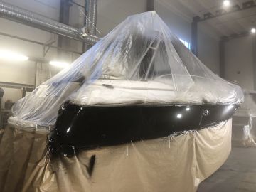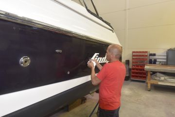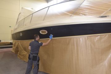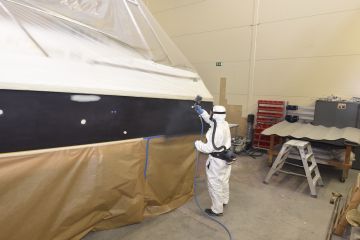 Suomessa ammattimaisia veneiden ruiskumaalauksia tekeekin lähinnä muutama isompi, täyden palvelun venetelakka. Tässä tapauksessa tekijäksi valikoitui telakointipalveluiden lisäksi kaiken kattavia veneiden huolto-, korjaus- ja saneerauspalveluita tarjoavan Hopeasalmen Telakka Oy:n Tolkkisten Telakka, jonka toimitiloissa on tarkoituksenmukainen maalaushalli.