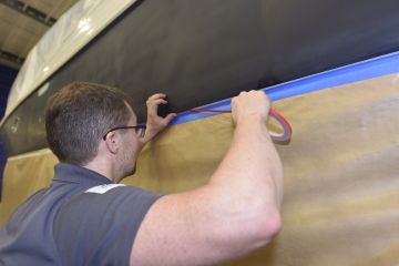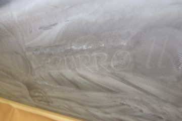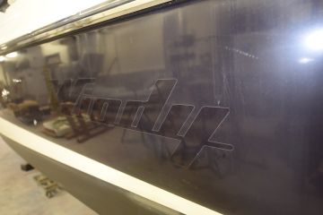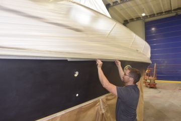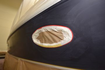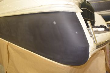 Näille kyljille haluttiin kuitenkin uusi elämä. Sellaisen tarjoaisi teippaus, mutta lähtökohtaiseksi vain muutamien vuosien ajaksi. Uuden veneen tasainen värigelcoatpinta syntyy muotissa, mutta vanhaa venettä ei muottiin voi uudelleen laittaa. Värigelcoatia pystyy kyllä maalaamaan käsin, mutta etenkään isoista pinnoista ei tule tasaisuudeltaan ja ulkonäöltään uuden veroisia, vaikka tekijänä olisi millainen mestari.