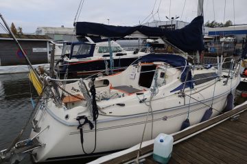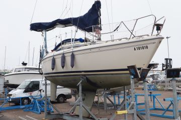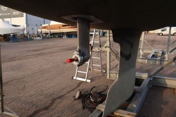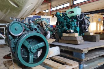 Maxi Fenix -purjevene telakoituna Suomen Venehuolto Oy:n pihaan ja odottamassa uuden voimalähteen asentamista. Lisää potkua on odotettavissa, sillä vanha 7-hevosvoimanen MD5B vaihtuu moderniin 12-hevosvoimaiseen D1-13 -moottoriin.