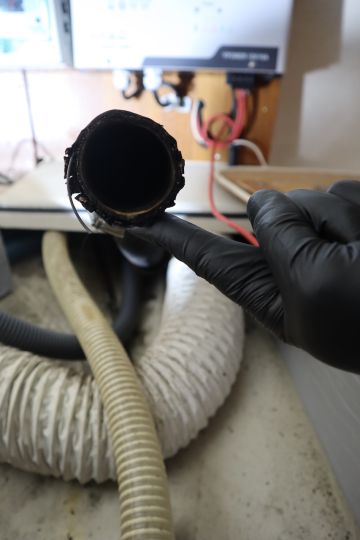 Pakoletkun kohdalla selvittiin leikkaamalla rispaantunut pää pois ja yhdistämällä pakoletku uuteen vesilukkoon. Vanhassa vesilukossa kumisisusta oli palanut ja pullistunut.