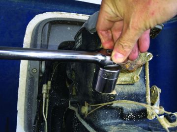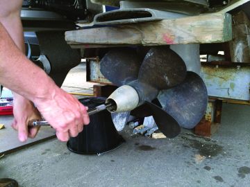 Tarvittavat työkalut: Torx-ruuvauskärkiä, momenttiavain, 30 mm hylsy, hylsynväännin ja jatkovarsi, Volvo Pentan potkurimutterin erikoistyökalu, jäteöljyastia.