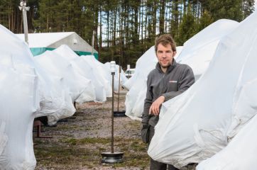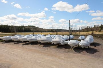 Suurin osa säilytettävästä kalustosta on perämoottoriveneitä, jotka yrittäjä Davy Gustafsson pakkaa kutistemuoviin ja sijoittaa avoimelle kentälle sotilaallisen täsmällisiin riveihin perämoottorit vastakkain.