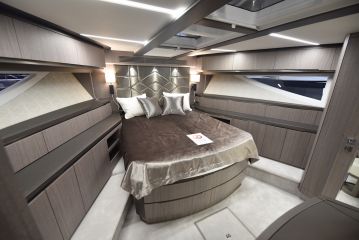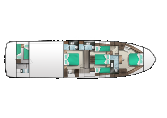 Vakiotilaratkaisun suurin vaikeus on päättää omistajankajuutasta. Sekä keulan että keskiveneen isot sviitit täyttävät mitat. Keskiveneessä on ehkä hiukan enemmän neliöitä ja ainakin isommat runkoikkunat, mutta keulassa enemmän yksityisyyttä. Neljän kammarin ratkaisu on optiona, samoin valinta perän varaston, miehistökajuutan tai kumivenetallin välillä.