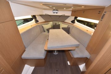 Kympissä on iso avotila, johon kuuluu hulppean kokoinen u-sohva ja pentterikeidas. Komentosillalta löytyy jopa neljä rinnakkakista istumapaikkaa. Suomen suvea ja veneen ulkonäköä ajatellen iso asia on täysleveä tuulilasi, joka suojaa viimalta ja näyttää hyvältä.