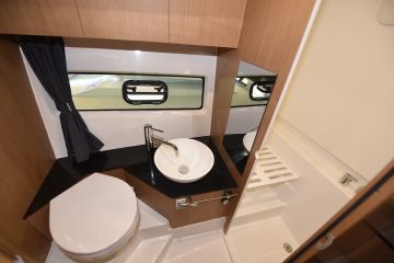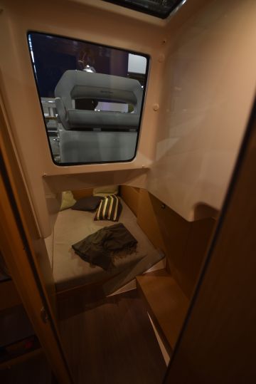 Kannen alla on yllättävän hyvin tilaa. Keulassa on tuttuun tapaan sisäsalonkina toimiva v-sohva, jonka on pedattavissa parivuoteeksi. Taaempana on ovella muusta kajuutasta eriytetty parivuoteellinen makuukajuutta ja tiloiltaan monet matkaveneet häpeään jättävän kokoinen toiletti, johon kuuluu erillinen suihkukomero.
