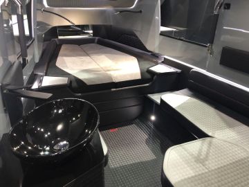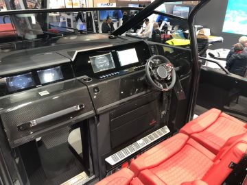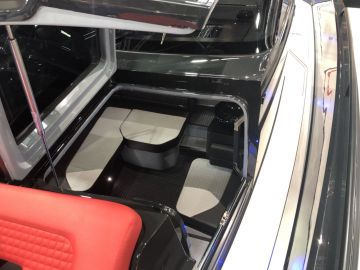 Ulkotiloissa ainoa ero Axopar 37:aan on punaiset penkit ja gunmetal gray -maalaus, joka on viimeistelty käsin syvästi kiiltäväksi. Kojelaudassa erottuu hiilikuitupaneelit ja rivi kosketusnäyttöjä. Kajuataa on viimeistelty Brabus-väreillä ja -materiaaleilla tumman puhuvaksi. Seinällä on 42-tuumainen Apple-tv.