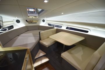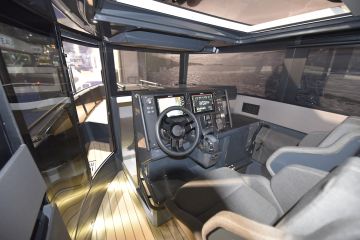 Ohjaamossa on supermakea offshore-istuimet. Kojelaudan etupuolelta kuljetaan parivuoteella ja erillisellä toiletilla varustettuun kajuuttaan tai kaaravasta etuovesta ulos.