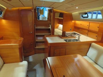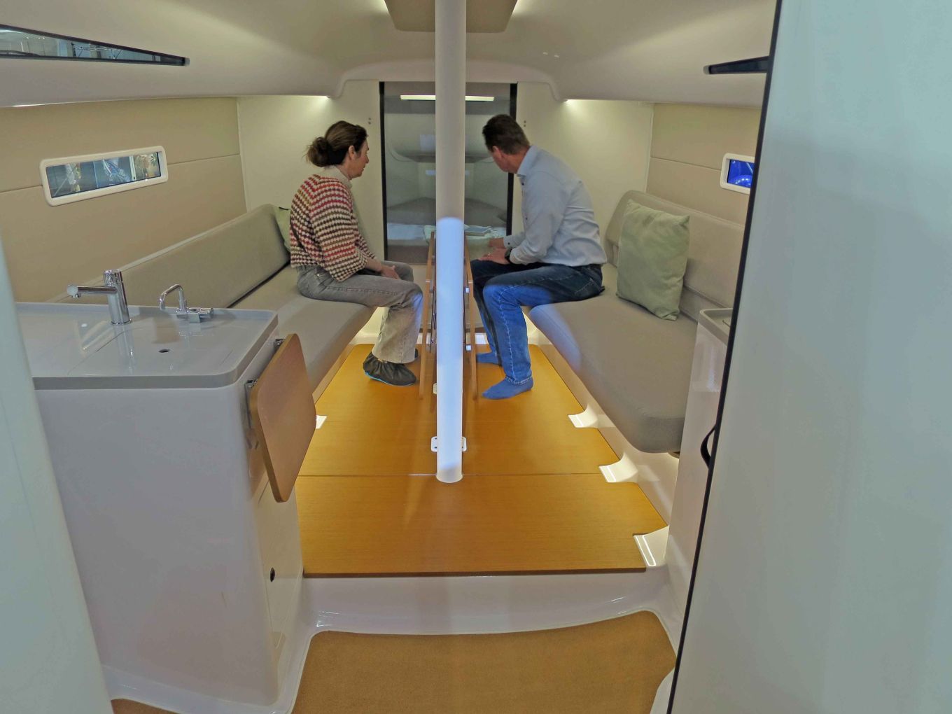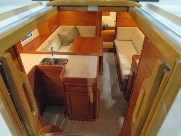 Düsseldorfissa esitellyssä veneessä salongissa oli ruokailuryhmää vastapäätä suora sohva, joka selkänojan nostamalla avautuu kunnolliseksi meripunkaksi vapaavahdille. Suomeen saapuvassa veneessä nähdään toinen salonkivaihtoehto, jossa samalle laidalle sijoitetaan kaksi muhkeaa nojatuolia ja niiden väliin pieni kirjoituspöytä.