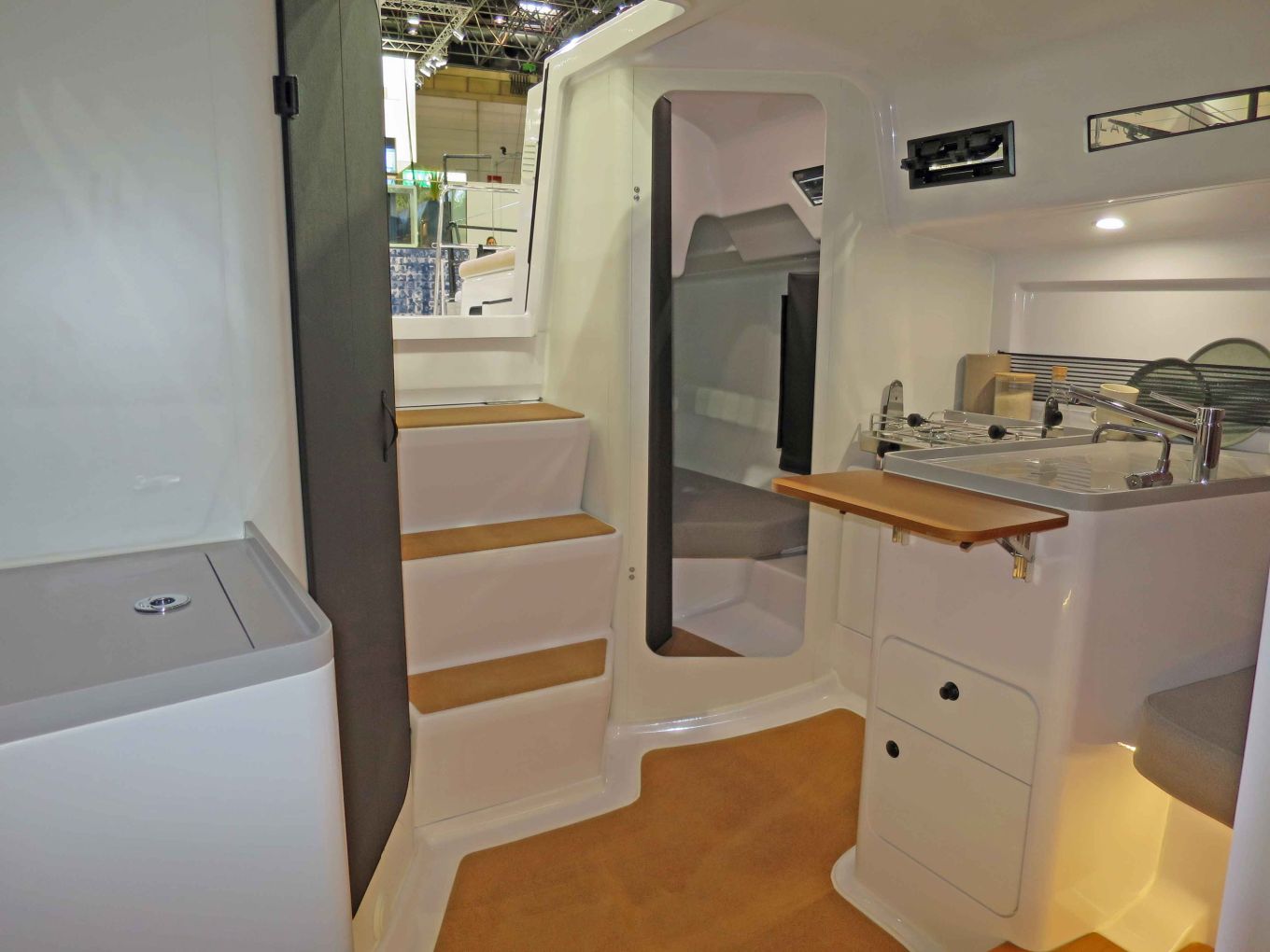 Sisällä on hyvän kokoiset vuoteet neljälle aikuiselle, retkitasoa runsaammat varasto- ja ruonlaittotilat sekä odottamattoman suuret hygieniatilat. Tasoa laskee ainoastaan melko karuksi jäävä viimeistely ja paljaat muottipinnat, mutta ratkaisu on perusteltu keveyttä ja suorituskykyä tavoiteltaessa.