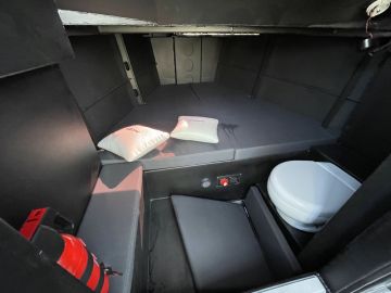 Istumapaikat on asemoitu kolmeen, ajosuuntaan istuttavaan riviin. Katon alla on neljä tukevaa erillisistuinta, joista etummaisiin eli ohjaamon penkkeihin saa iskunvaimennuksen. Peräpenkkiä riittää koko veneen leveydeltä, mikä tarkoittaa neljää istumapaikkaa lisää. Erillistuimien keskellä turkissa on merkillinen syvennys, jonka tarkoitus lienee helpottaa penkkien välissä liikkumista. Syvennys ei ole itsetyhjentyvä, joten se on varustettu sähköisellä pilssipumpulla.