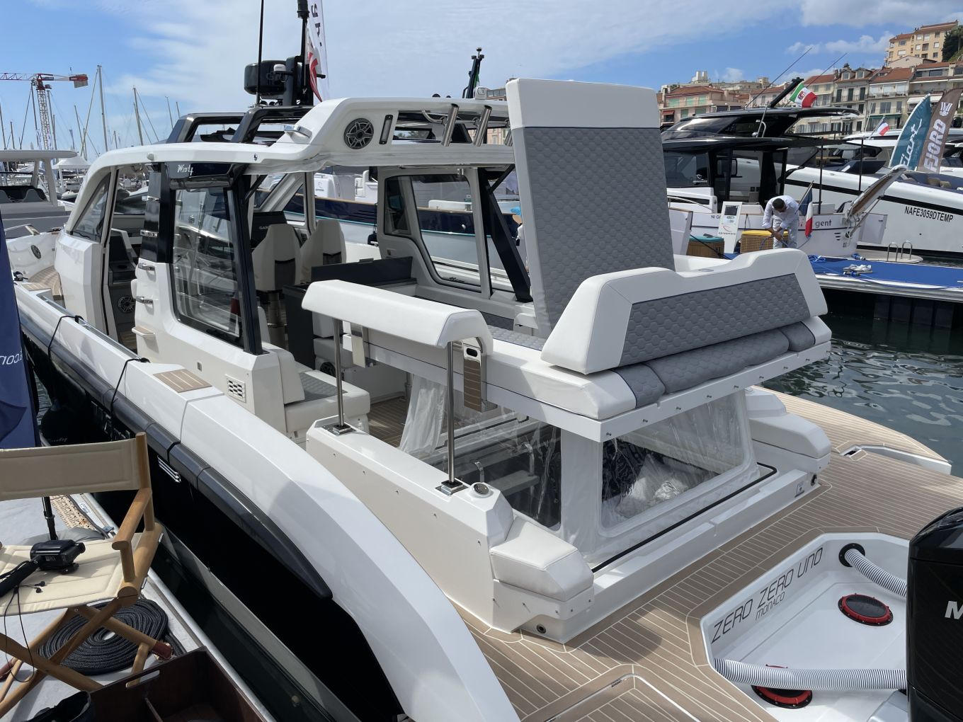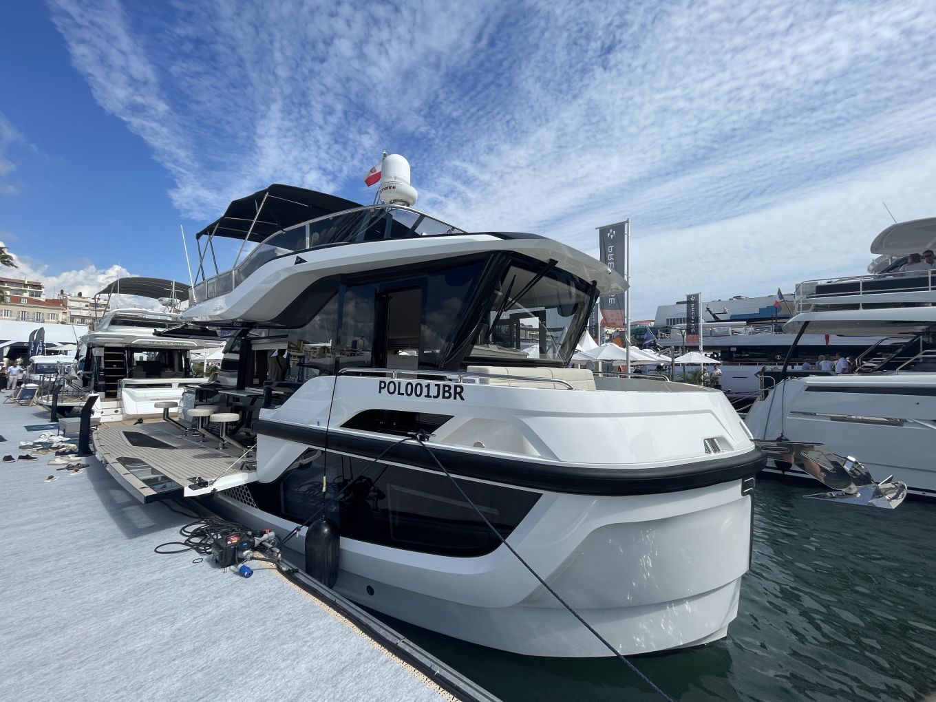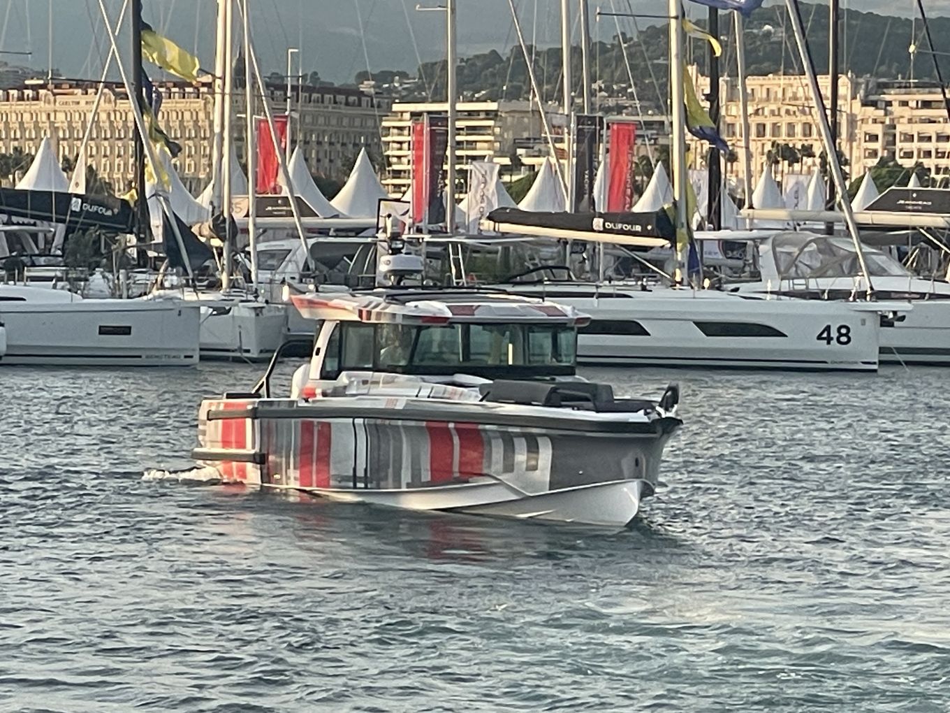 Cannesissa kokemus on paljon hektisempi, ja näyttely on jaettu hankalasti kahteen toisistaan etäällä olevaan satamaan, Vieux Portiin ja Port Cantoon. Vaihto tapahtuu jouheimmin vesibussilla tai ribkyydillä, mutta varsinkin koko moottoriveneantiin tutustuvan aikaa ja vaivaa se joka tapauksessa vie. Moottoriveneitä kun on esillä molemmissa satamissa, purjeveneitä vain Port Cantossa.