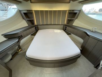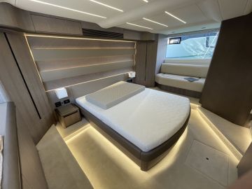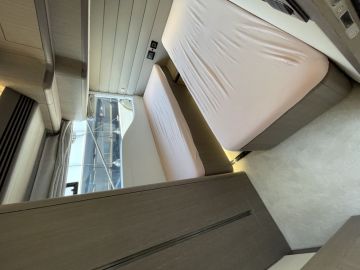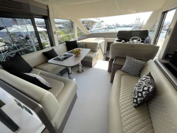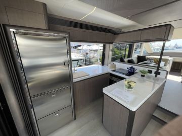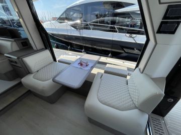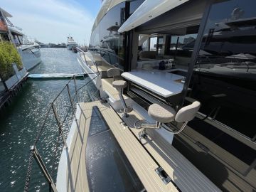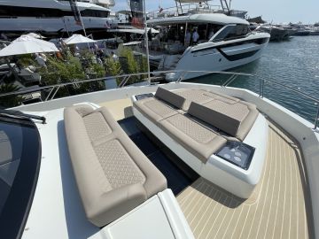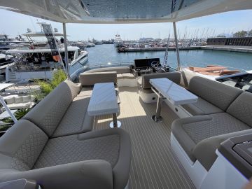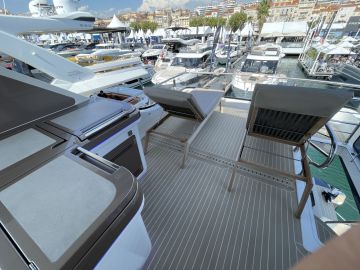 Sisätilojen ohella myös ulkotilat ovat mittavat. Keulakansi on hyödynnetty täysimittaisena oleskelutilana, jossa voi makoilun lisäksi istua mukavasti vastakkain sohvilla. Flybridge on kokonaan oma lukunsa, josta löytyy kulmapentterin lisäksi veneen selkeästi suurin yhtenäinen sohvaryhmä. Flybridgen takaosaan mahtuu mukavasti pari irtokalustetta, kuten vaikkapa messuveneen aurinkotuolit. Painon säästämiseksi hiilikuidusta valmistettu HT-kate kuuluu lisävarusteisiin.