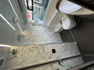 Omistajansviitti on kuitenkin keskiveneessä, jossa leveys (ja runkoikkunat) ovat suurimmillaan. Toiletit on sijoitettu peräkkäin paaran puolelle. Omistajan sviitti on saanut niistä suuremman, mutta ei kuvissa olevaa, kahdella sisäänkäynnillä varustettua päivätoilettiakaan voi ahtaaksi sanoa. Isompien makuukajuuttojen väliin styyrpuurin laidalle on jäänyt tilaa kahden vuodepaikan kammarille. Sielläkään vuoteille ei tarvitse kavuta, sillä tilaa on riittänyt kerrosvuoteen sijaan kahdelle erillisvuoteelle.