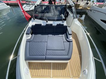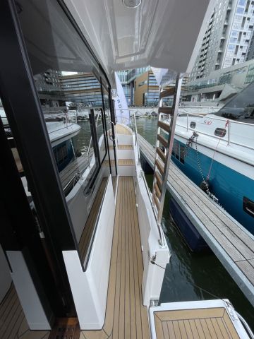Myös keulakannella mahtuu hyvin kulkemaan ja maihinnousu on turvattu Suomeen sopivasti ankannokalla, portailla ja kaiteilla. Loikoilua varten keulakannelle saa selkänojalliset aurinkopatjat. Ulko-oleskelutilaa löytyy lisäksi yläkannelta, jonne noustaan keulakannelta tuulilasin ulkopuolella olevia tikapuita. Loikoilupatjojen lisäksi yläkannelle saa lisävarusteena ulko-ohjauspisteen.