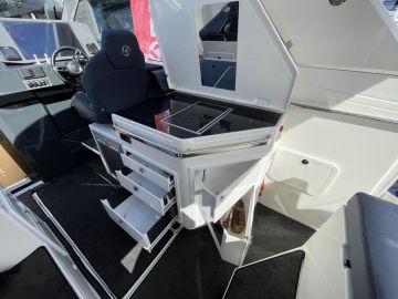 Maltillisten nopeuksien koeajolla meno on korostuneen mukavaa, sillä jäykän tuntuinen ja keulasta terävä alumiinirunko halkoo aaltoja huomattavan pehmeästi ja huomaamattoman hiljaisesti. Vesillä olo on O’boatsilla sivistyneen nautittavaa, kuvaan sopisi hyvin esimerkiksi eväskori ja pullo kuplivaa. Antimia voikin sitten nautiskella rennommin keulasohvalla loikoillen tai muodollisemmin tyylikkään puupöydän ääressä istuen.