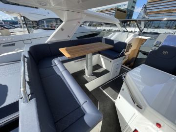 Sisäohjaamo ja sen jatkeena oleva täydellinen pentteri sekä kansisalonki muodostavat taka-avotilan kanssa samalla lattiatasolla olevan yhtenäisen oleskelutilan, kun styyrpuurin laidalle niputtuva nelilohkoinen takaseinä avataan kokonaisuudessaan. Parilla lisäpalalla koko paapuurin laidan ja perän saa muodostettua yhtenäiseksi sohvaksi, jonka pituus täytyy olla kymmenmetristen veneiden maailmanennätys.