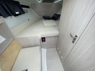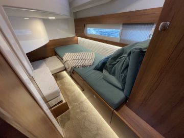 Sisätilojen yllätys on erillinen takakajuutta, jonne laskeudutaan aurinkotason päädystä avautuvasta luukusta. Aurinkotason ja U-sohvan alle on saatu sijoitettua huomattavan hyvän kokoinen kajuutta, jossa on pitkittäin paapuurin laidalle asemoitu parivuode ja runsaasti kaappitilaa. Keulakajuutta on tutulla paikallaan ja pitää sisällään parivuoteen lisäksi erillisen toiletin.