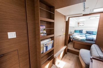 Vakiona omistajan sviitti on styyran puolella ja vierastilat paarassa. Vierasrungossa on makuuhytit keulassa ja perässä, ja pesutilat sijoittuvat niiden väliin.