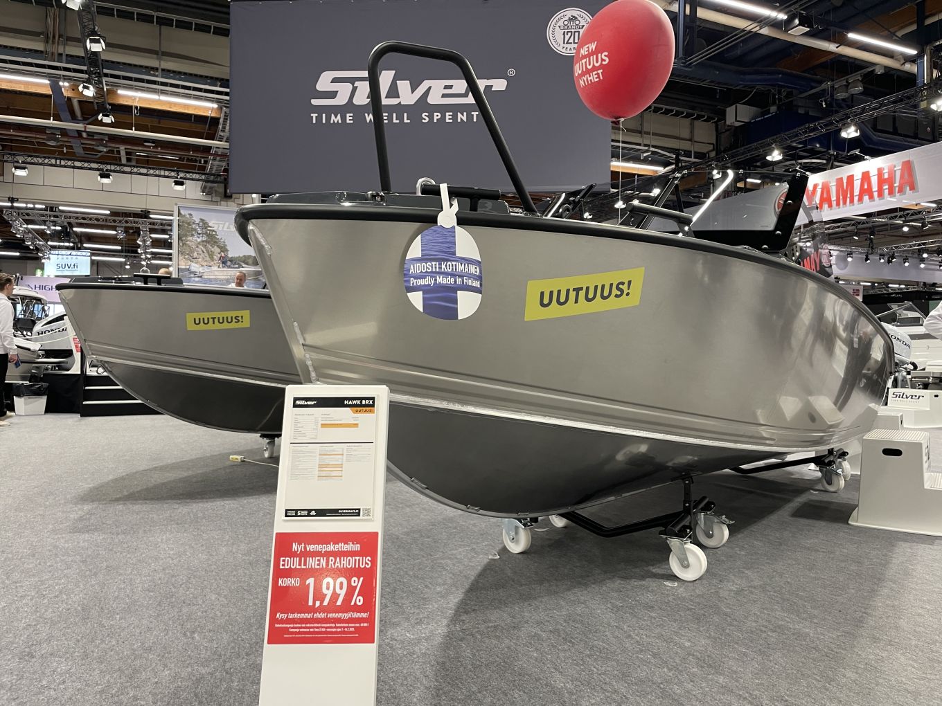 Silver-, Faster-, TG- ja Terhi-veneitä markkinoivan Brandtin messuosastolla on voimassa 1,99 prosentin korkotarjous kaikkiin edellä mainittuihin venemerkkeihin. Yhteistyö on toteutettu Santander-pankin kanssa. Näillä näkymin tarjous on voimassa ainoastaan messujen ajan, joten kaupat pitäisi tehdä viimeistään sunnuntain 16.2. aikana.