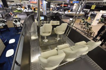 Pulpetin ja etenkin tuulilasin muotoilu on linjakasta. Vakiovarustukseen kuuluu Simradin suuri 16-tuumainen monitoiminäyttö mediasoittimella. Messuveneen matkustamon muodostaa viisi nahkaverhoiltua erillisistuinta, mitkä etäännyttävät loputkin ajatukset työvenemäisyydestä. Samaan kategoriaan kuuluu messuveneen maukas runkoteippaus – toiselta puolelta tumman harmaa ja toiselta valkoinen.