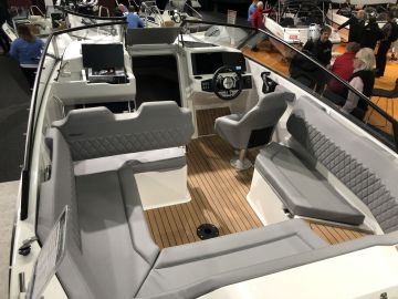 Kuskin paikalla on hyvin jalkatilaa, joten ajoasento on henkilöautomainen ja ergonomia keskimääräistä parempi. Kaasukäsikin on saanut kyynärnojan. Plotteri on vakiona 9-tuumainen, ruksi oikeaan lisävarustelistan ruutuun muuttaa sen kolme tuumaa suuremmaksi.