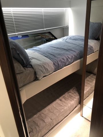 Klassiseen sportcruiser-tyyliin pentteri on alakerrassa, josta löytyy makuukajuuttojen ja toilettien lisäksi myös pentterin kupeessa oleva kompakti sohvaryhmä, joka sopii esimerkiksi aamiaisen aloitteluun, jos aamu sarastaa yläkertaan jo liian kirkkaasti. Astianpesukoneella varustettu pentteri on mallia u, joten lasku- ja säilytystilaa riittää.
