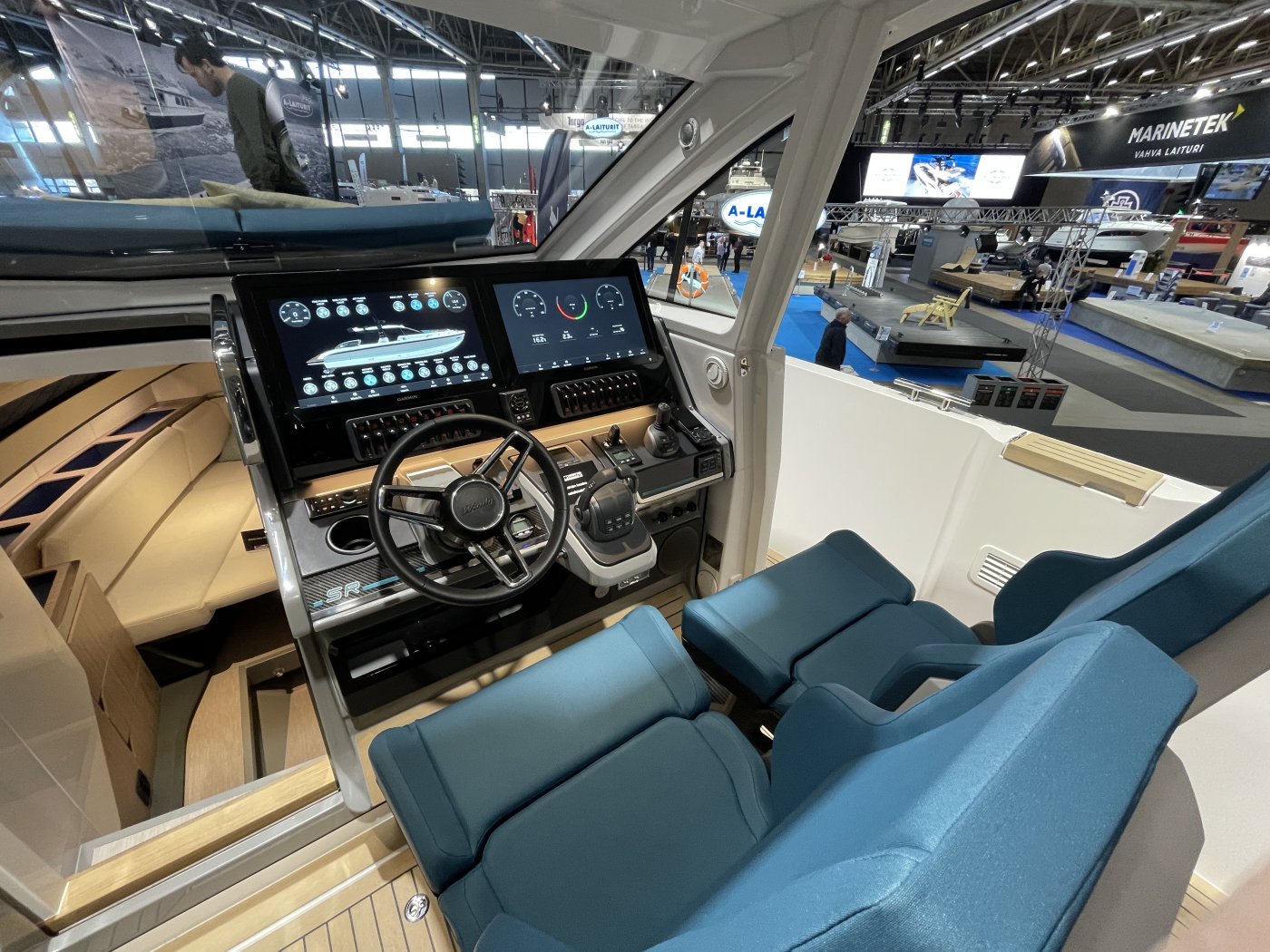 Ohjauspulpetin tuuli- ja sivulasit ulottuvat jykevään t-top-kattoon asti, joten ainakin keskimmäisenä istuva kippari on varmasti vähintäänkin kohtuullisen hyvässä suojassa ajoviimalta. Sitä nimittäin riittää, sillä tupla-V12-koneilla huippunopeus nousee 54 solmuun.
