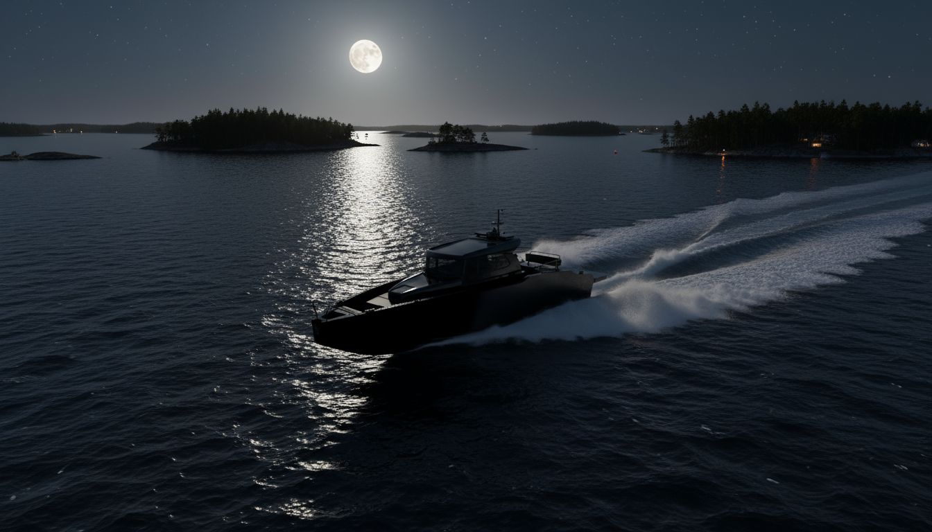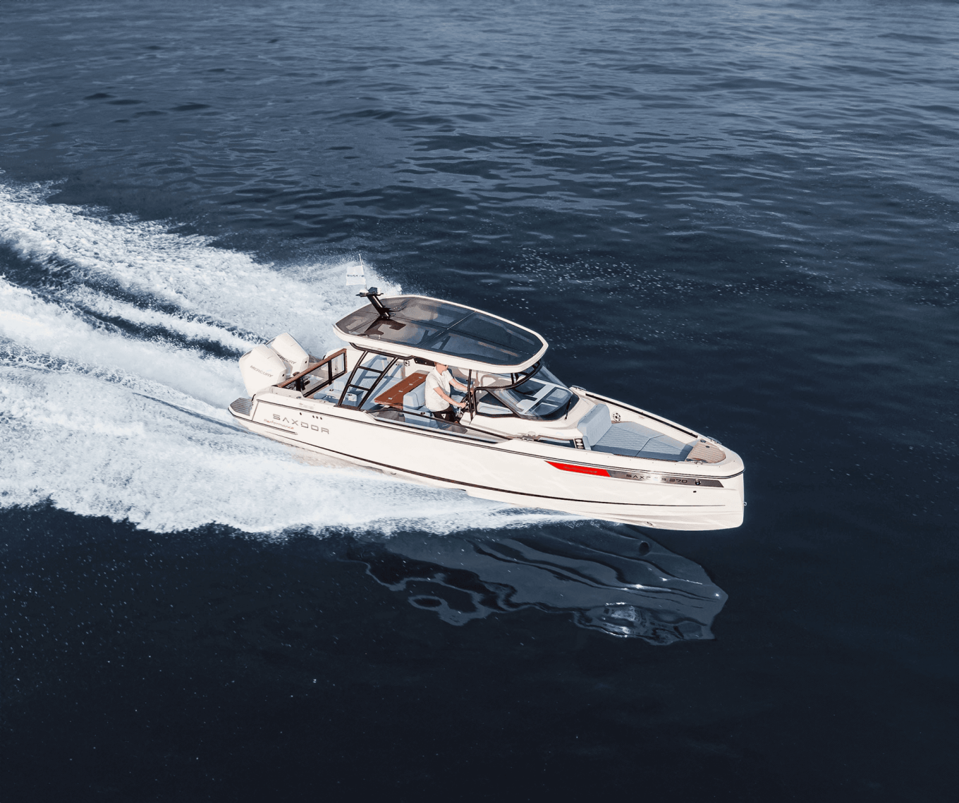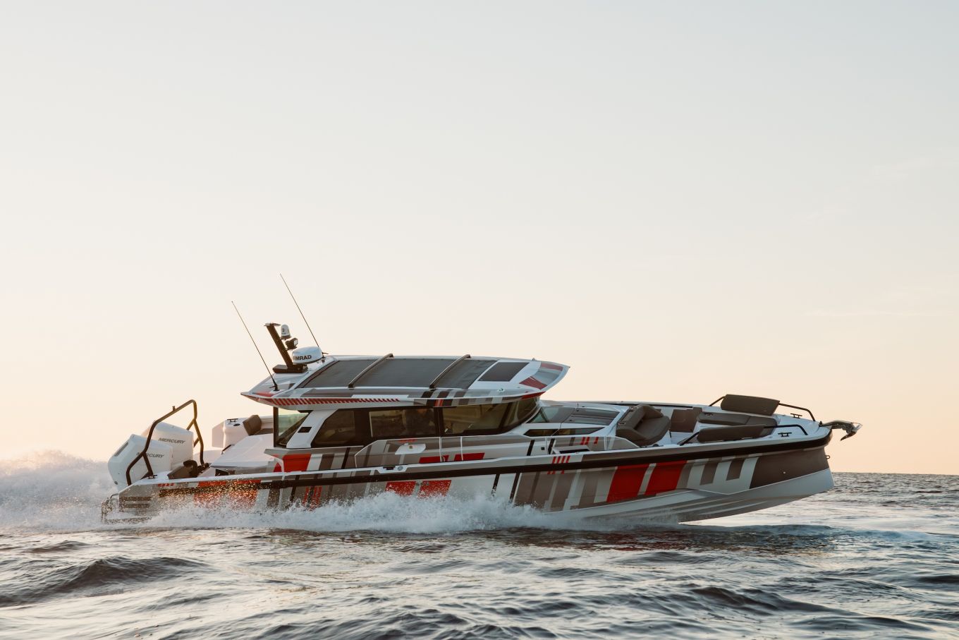 Jo pelkästään sen numeroarvot ovat hulppeita: pituus 11,12 m, leveys 3,43 m, paino 8 000 kg, polttoainesäiliö 1 570 l. Ja nyt puhutaan siis keskipulpettiveneestä, jonka moottoreina on kaksi Mercuryn 7,6-litraista ja 600-hevosvoimaista V12-perämoottoria. Hintalapunkin lukemaa voi kuvailla korkeaksi, se on 600 000 euron luokkaa. Toisaalta sillä saa varmasti vakuuttavan kalaveneen.