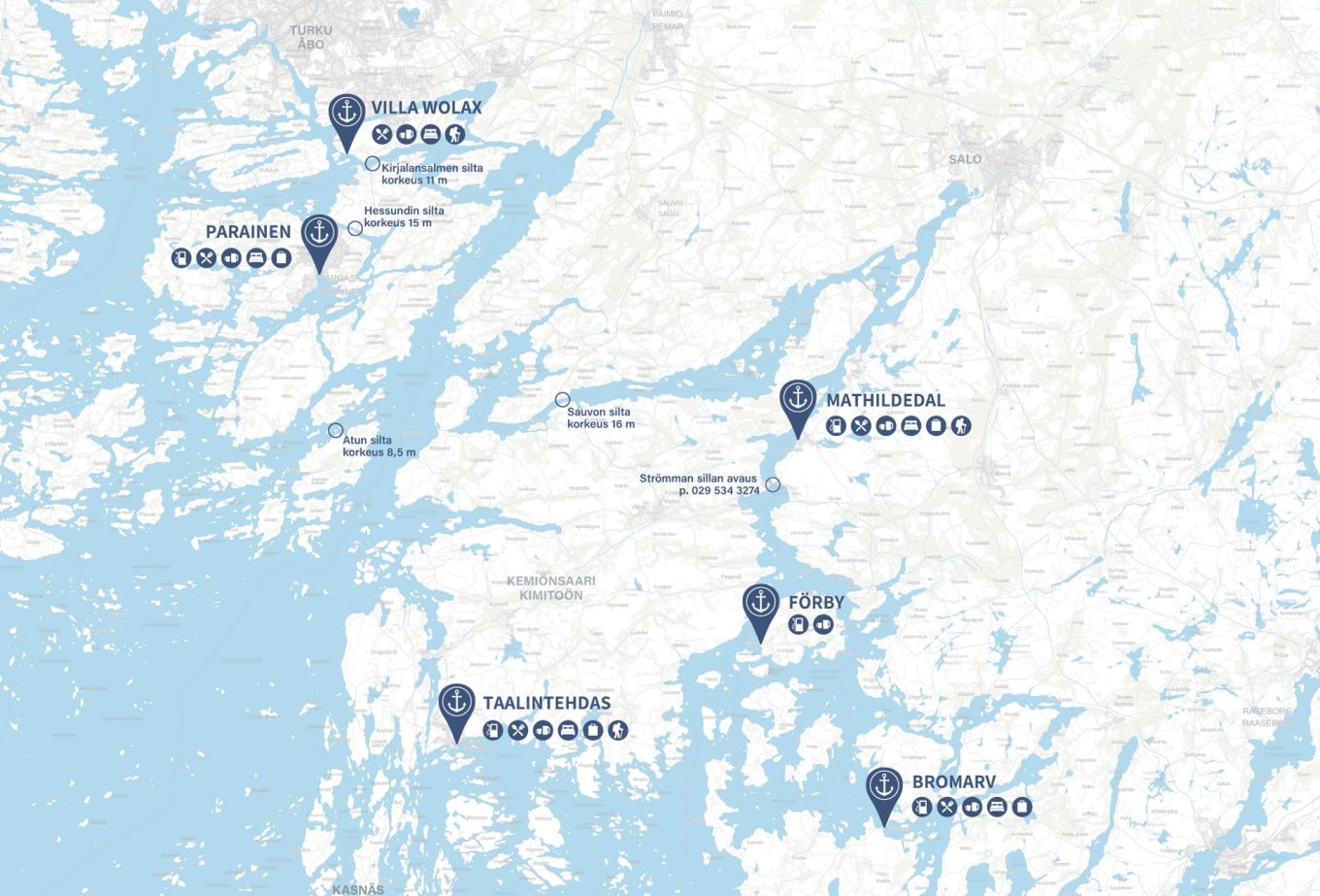 Jokainen satama on omanlaisensa ja niitä kehitetään aktiivisesti. Esimerkiksi Taalintehtaan satamaan asennettiin viime kesänä uudet, kävelyaisoilla varustetut laiturit ja massiivinen aallonvaimennin suojaamaan satamaa. Tänä kesänä Taalintehtaan palvelutarjonta vahvistuu uudella hotelli-ravintola Ullman’s Villalla. Mathildedalin satamaa on kunnostettu kevään aikana, ja myös suosittu ulkoporeallas on uusittu. Villa Wolaxin satamaa on puolestaan laajennettu jo 40-paikkaiseksi.