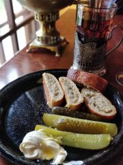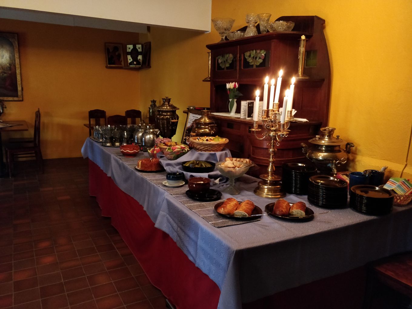 Siitä muodostuikin koko reissumme kulinaristinen kohokohta. Venäläistyyliset kaali- ja lohipiirakat, suolakurkut tönköllä mutta juuri ja juuri juoksevalla hunajalla ja smetanalla sekä iso lasi maukasta teetä hunajan tai hillon kera. Päälle hedelmiä, kuivakakkuja, keksejä ja konvehteja. Kaikki vähän hämärässä, kynttilän valoon katetussa salissa. Melkein maagista.