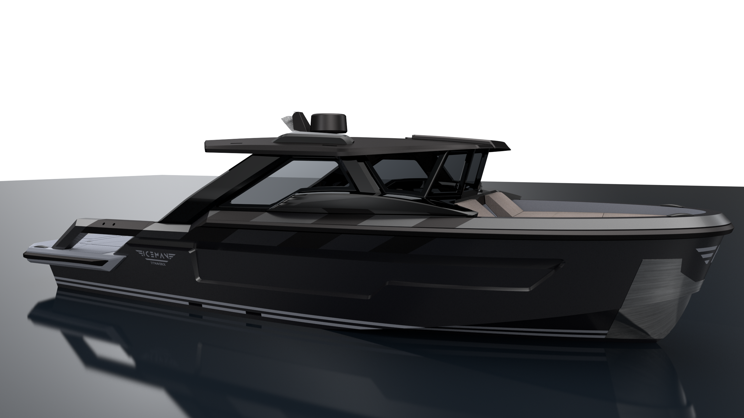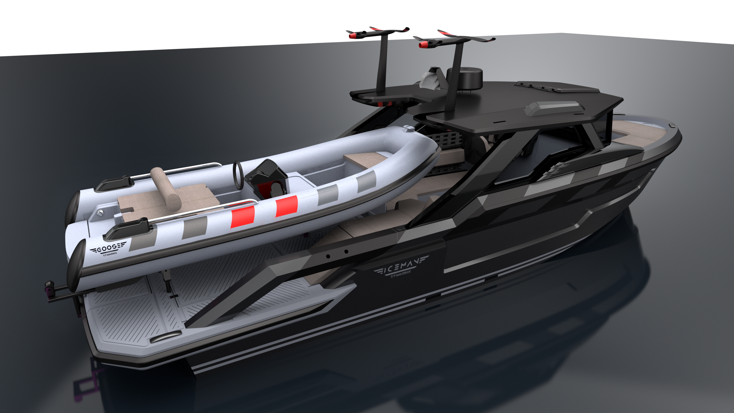Eteen sijoitettu ohjaushytti mahdollistaa sen, että Iceman kykenee kuljettamaan takakannella omaa pientä tenderiään, 4,35 metriä pitkää rib-venettä.