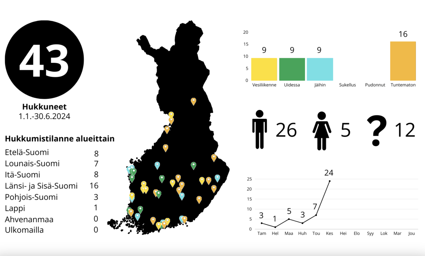 Suomen Uimaopetus- ja Hengenpelastusliiton (SUH) keräämien ennakkotilastojen mukaan kesäkuussa hukkui 24 ihmistä. Vuoden alusta laskettuna hukkuneiden määrä on 43.