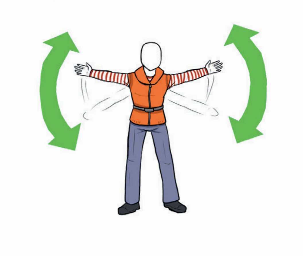 • Sivulle ojennettujen käsivarsien verkkainen ja jatkuva nostaminen ja laskeminen.